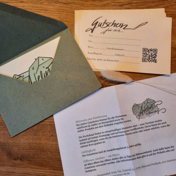 Der Gutschein kann für alles eingelöst werden, was es im Atelier gibt und ist 3 Jahre gültig.